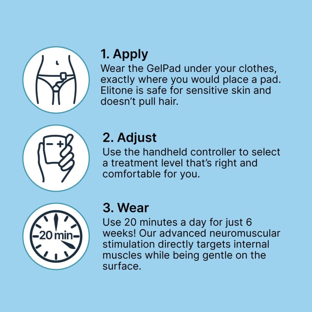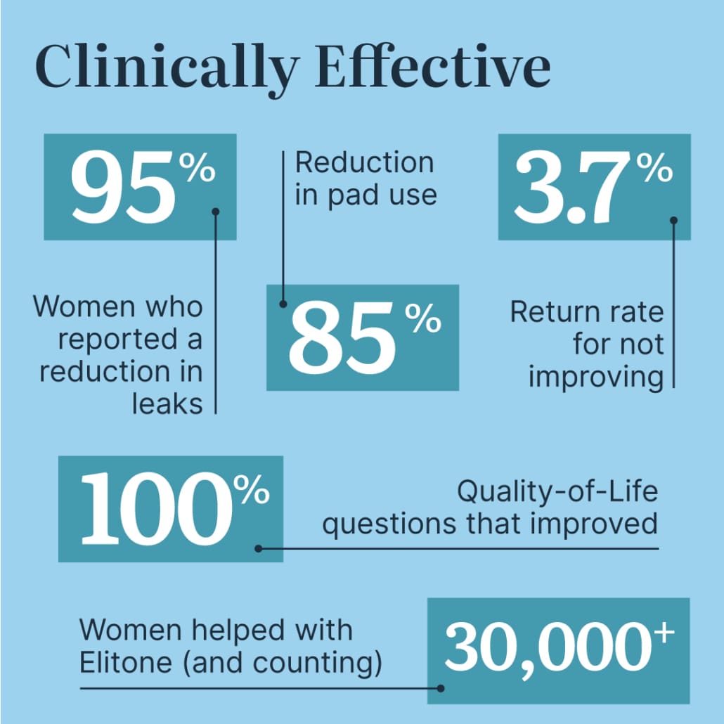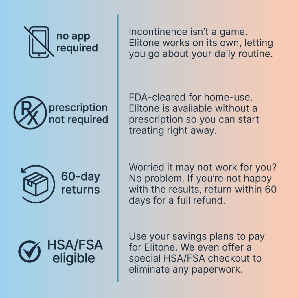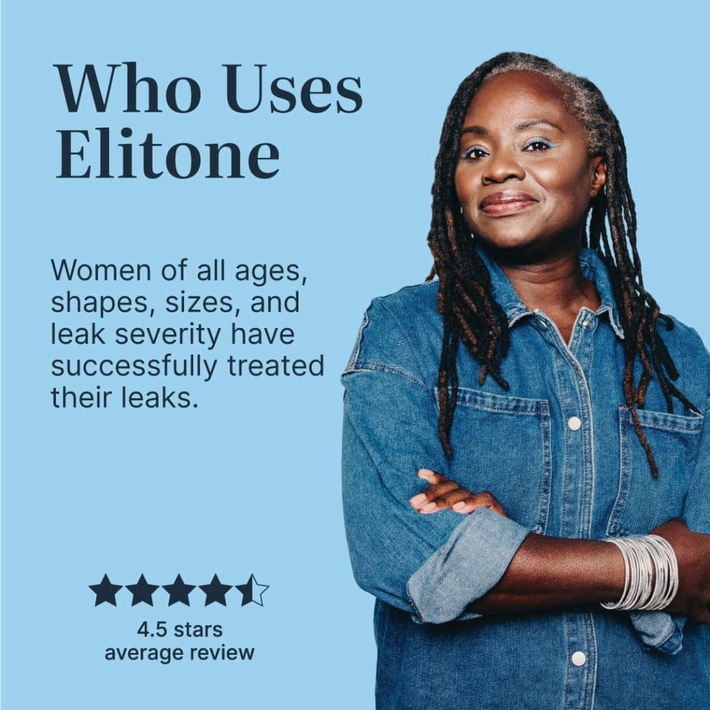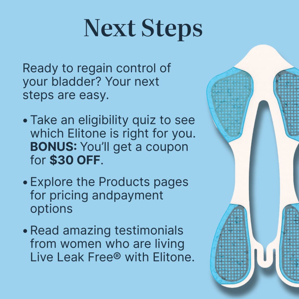 Congratulations! You're eligible to treat with Elitone. Elitone is FDA-cleared to treat stress urinary incontinence. Women like you have shown great success in as few as 6 weeks. Use code PelvicFix26 at checkout for $30 OFF Elitone.