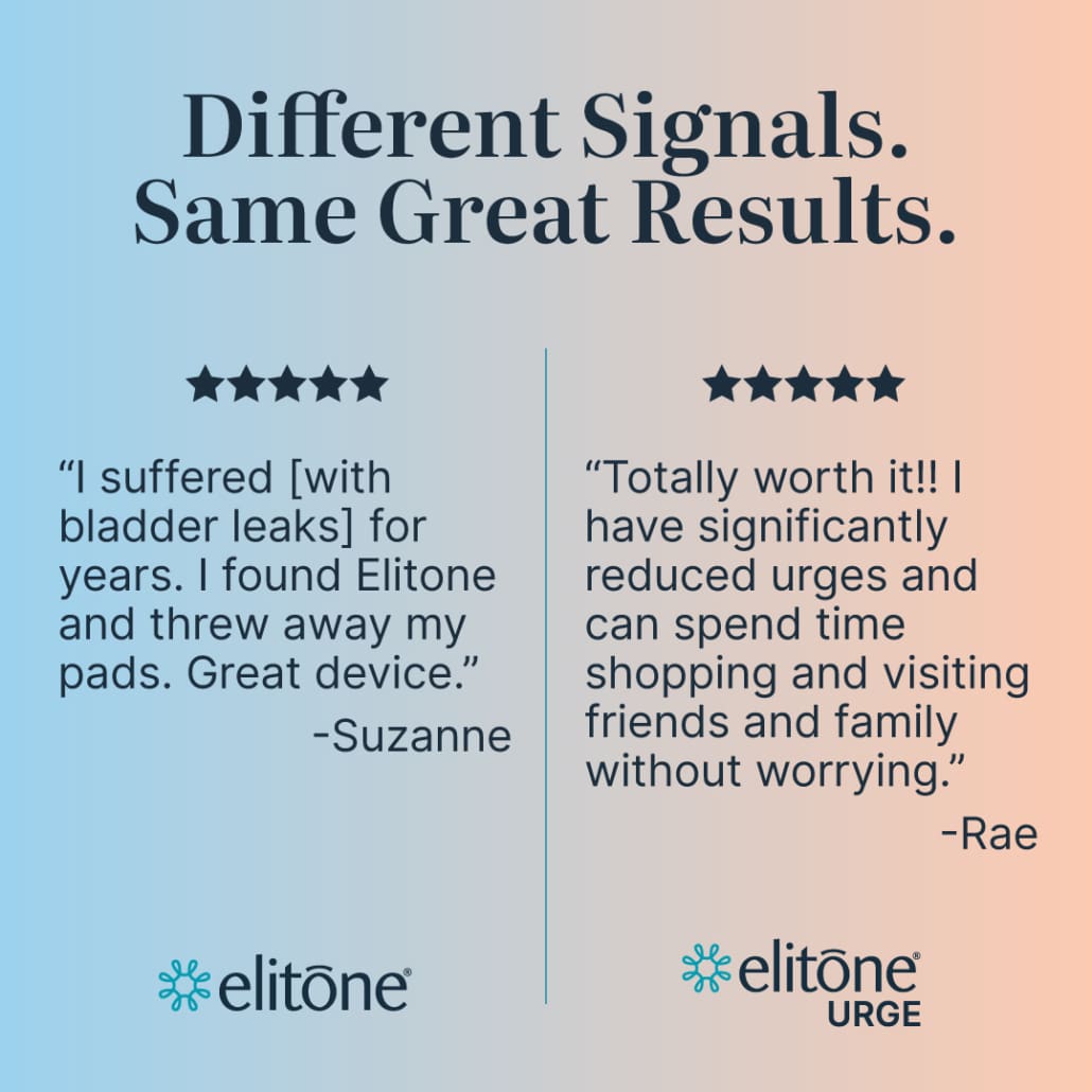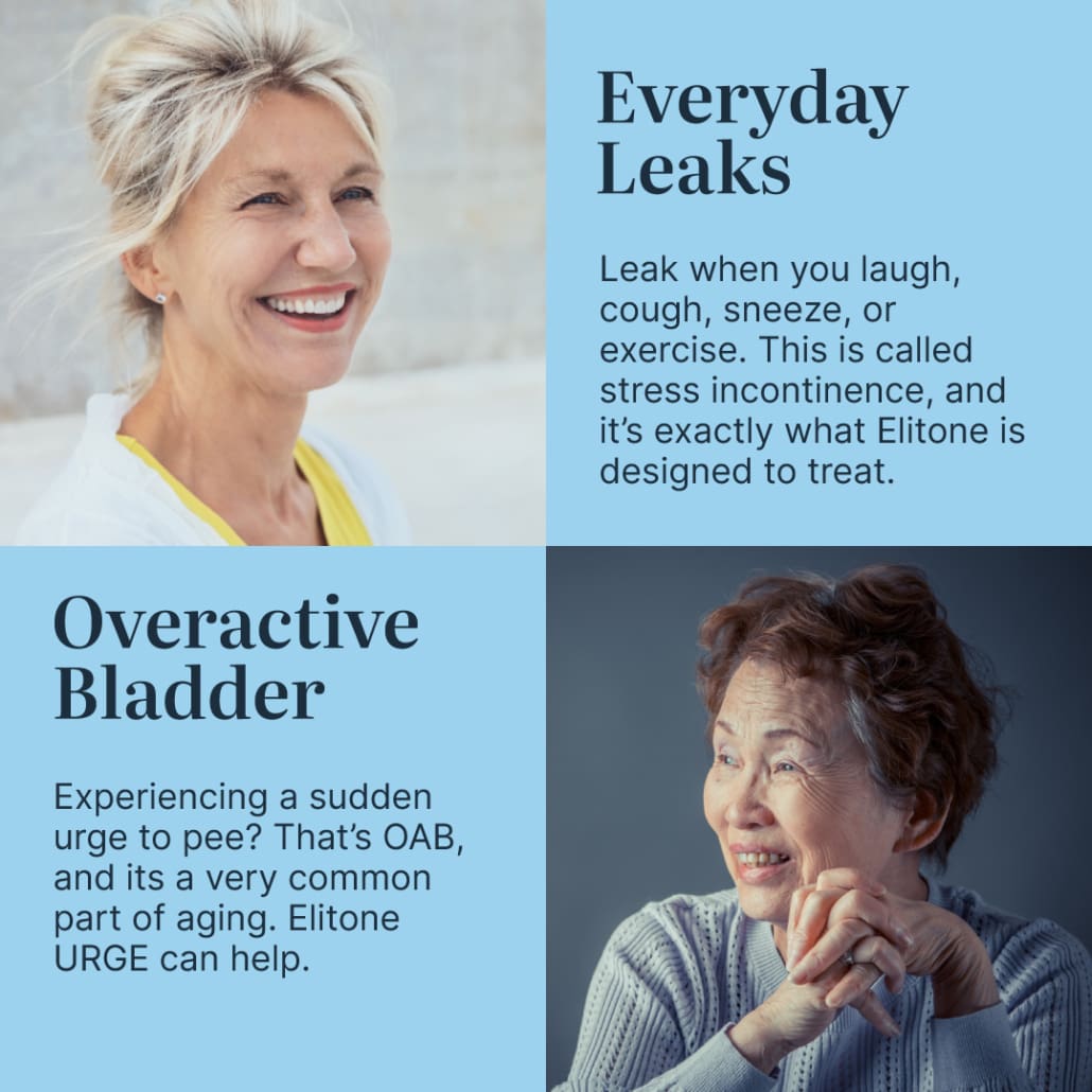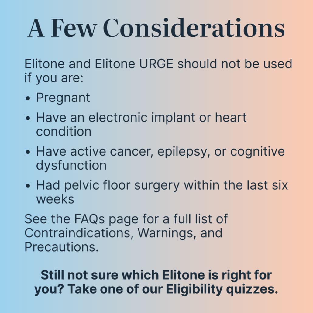 Congratulations! You're eligible to treat with Elitone URGE. Elitone URGE is FDA-cleared to treat urge urinary incontinence (i.e., Overactive Bladder leaks). Women like you have shown great success in as few as 6 weeks. Use code