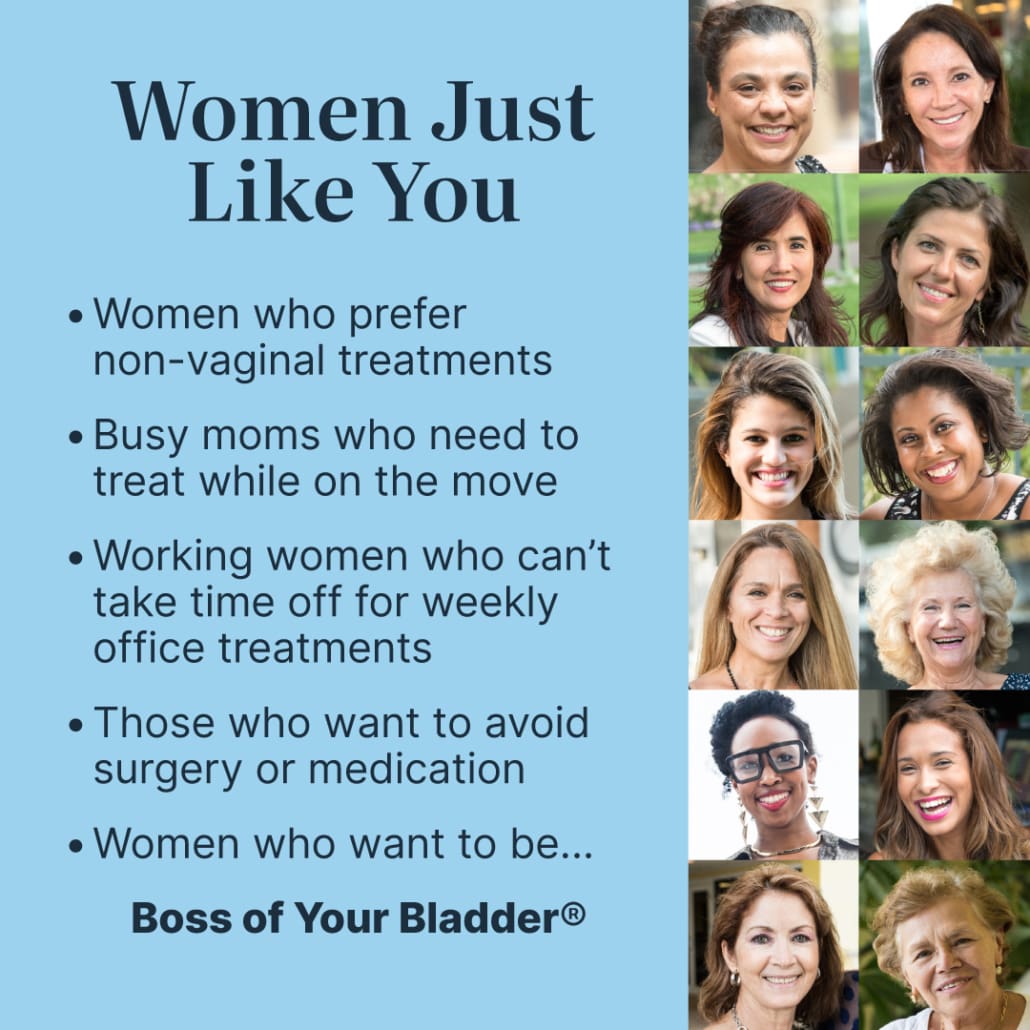 A gentle, wearable device for bladder leaks—completely external and easy to use. It’s time to become Boss of Your Bladder®.
