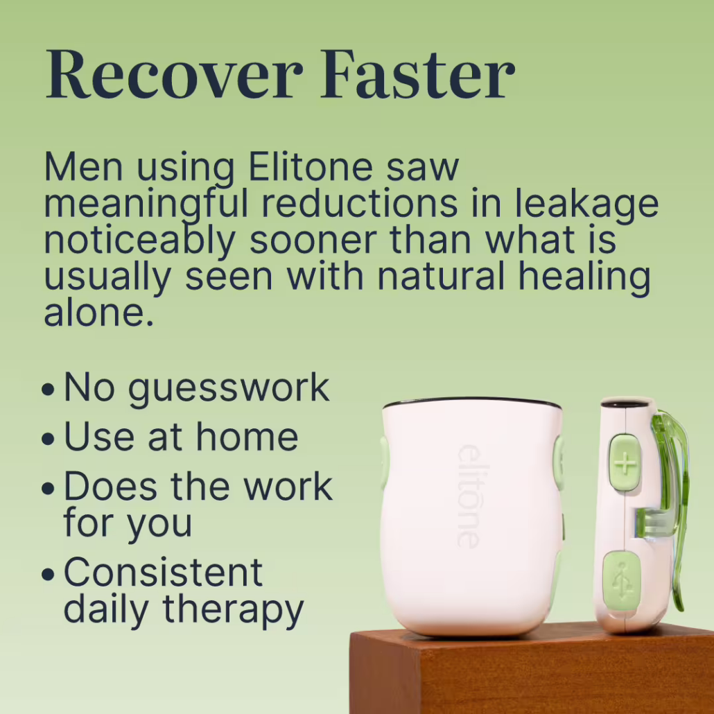 Regain bladder control with targeted, non-invasive therapy. Elitone for Men is a neuromuscular treatment to speed urinary incontinence recovery after prostate surgery. It strengthens the pelvic floor muscles responsible for bladder control, essentially kegel training for men. Post-prostatectomy incontinence is common while the muscles and urinary sphincter regain strength.